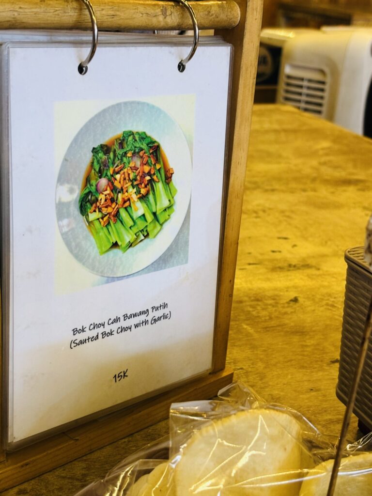 写真とおり、青菜炒めは15,000ルピアですが、