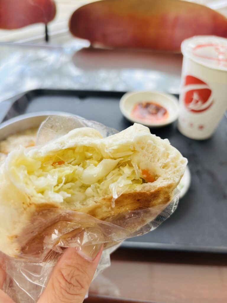 • シェントウジャンは、豆乳のほのかな甘さの素朴なお味で、とってもおいしい!干しエビとしらすが入っています。 野菜の肉まんはキャベツ、ネギ、春雨のようなものが入っていました。