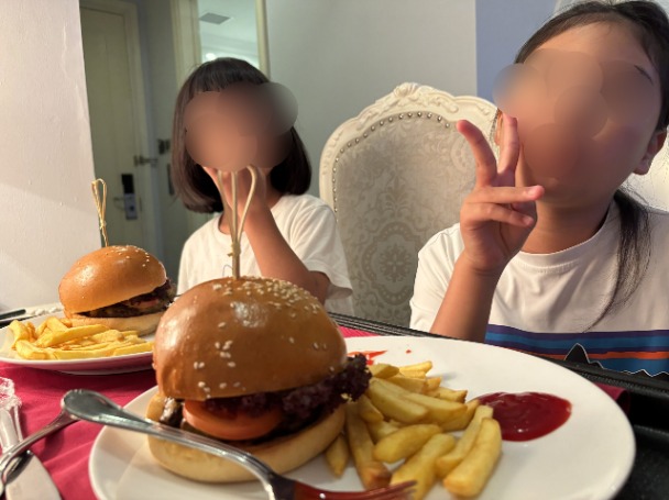 ルームサービス(写真右)も頼みましたが、キッズハンバーガーセットが1,300円程とお手軽価格なのもうれしかったです。