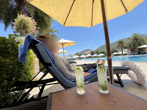たこすけはプールサイドで、ゴールドステータス特典で無料でもらえたモヒートをすするのでした。