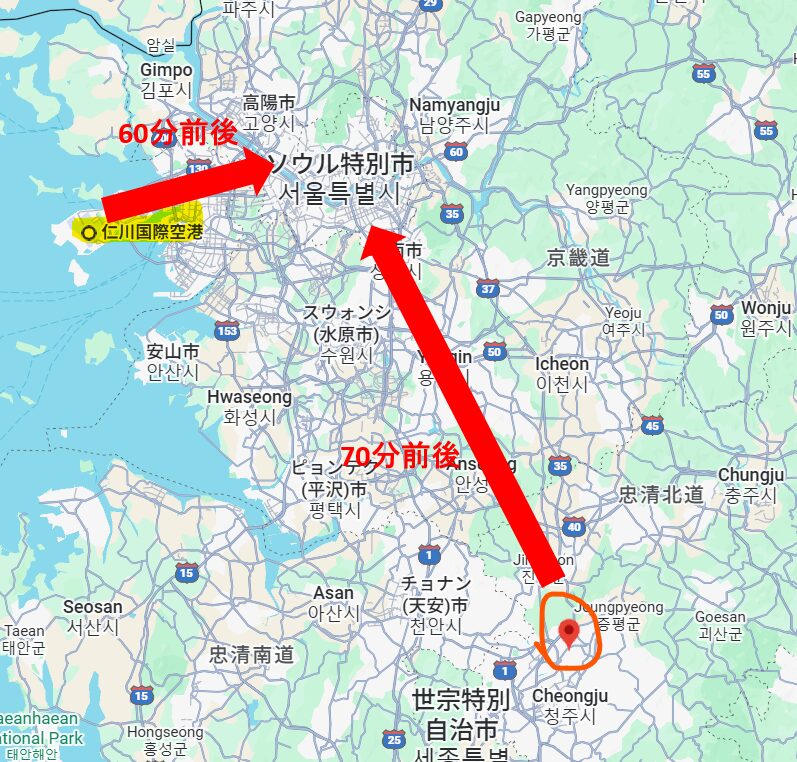 黄色網掛けが仁川空港。赤丸が清州空港。