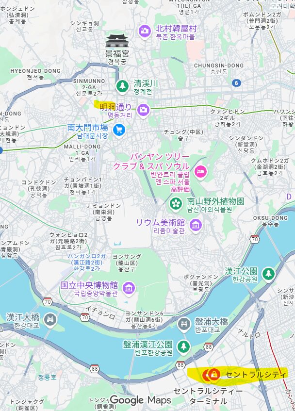 セントラルシティーターミナルの位置は以下。明洞の南側、江南エリアです。
