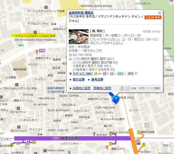 たこすけは、以下を条件にソウルの飲食店を選びました。