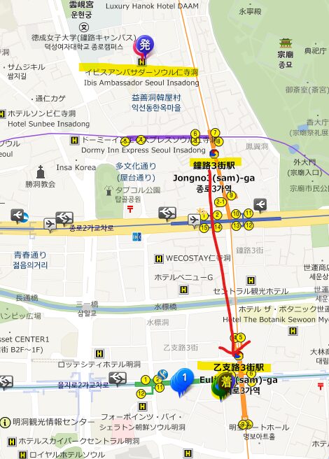 こちらも「イビスアンバサダーインサドン(リンク)」最寄りの地下鉄駅「鍾路3街」から一駅、「乙支路3街駅」すぐです。